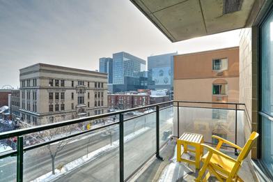 The unit is at 5th floor. In the heart of downtown east, at the corner of St-Hubert street and René-Lévesque Boulevard, the Pom is a 10-floor building with an intimate collection of 143 contemporary condo units. Built with superior quality construction, including common resident amenities such as rooftop pool and terrace, full gym, private screening room, a landscaped interior courtyard, and 4,000sf of ground level commercial spaces. Steps to Berri-UQAM, Central station, CHUM mega-hospital, Université du Québec, Quartier des Spectacles, Old Montreal, and the shops on Ste-Catherine St. Exclusions : electricity, internet, tenant insurance.