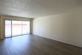 Contemporary second-floor 2BR/1BA in Oakland’s Civic Center neighborhood. Faux hardwood flooring runs throughout the home, with tile in the bathroom. A spacious, semi-open living room flows seamlessly to a private deck and connects to an open dining area with a ceiling fan. The galley-style kitchen features an electric stove and ample cabinet storage. Both bedrooms include walk-in closets, and the bathroom offers a shower-over-tub with sliding glass doors.