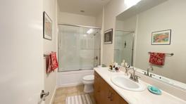 -5 burner gas stove, dishwasher, microwave, under cabinet lighting. Bright bathrooms with marble countertops, tiled floors, large mirrors, and automatic motion-sensing lights.