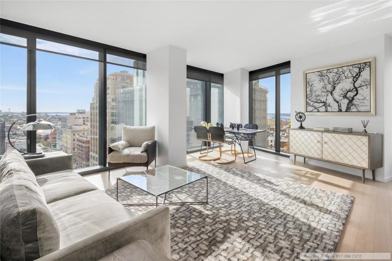 Oversized soundproof windows in living areas and bedrooms create bright, peaceful interiors with dramatic city views. Open kitchens are designed with custom-built cabinets and stainless-steel appliances. Baths feature Italian porcelain tile paired with sleek Porcelanosa fixtures. All residences include custom solar window shades and Bosch washers and dryers.