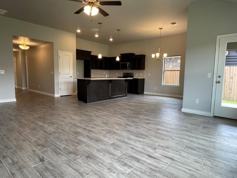The master bedroom is located at the front of the house and is a bright, airy retreat with plenty of natural light and a ceiling fan. It includes a full master bathroom with a walk-in shower and a spacious walk-in closet. The heart of the home is the open-concept living, kitchen, and dining area, all located at the back of the house. The entire space is covered with beautiful, wood-look tile, making cleanup a breeze. The kitchen is a true highlight, featuring a center island, a convenient breakfast bar, a gas stove, a microwave, a dishwasher, and a pantry.