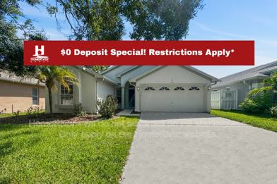 Beautifully updated, this home features fresh interior paint and brand-new laminate wood flooring throughout, no carpet. The open-concept floor plan creates a welcoming space, perfect for entertaining, with the kitchen seamlessly flowing into the living and dining areas. The kitchen is equipped with stainless steel appliances and offers both style and functionality. Double French doors open to a screened porch overlooking a tranquil pond, offering the perfect spot to unwind and enjoy the view. The spacious primary suite includes dual walk-in closets and a well-appointed ensuite bathroom with a garden tub, separate shower, and an abundance of counter space. Secondary bedrooms are generously sized and include ceiling fans for added comfort. Located in a top-rated school district and just minutes from shopping, dining, and the Suncoast Parkway, this home offers both comfort and convenience. Make this home yours today.