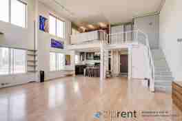 MODERN + SPACIOUS - over 1,000 square feet on this two-story 1 bedroom, 2 bath condo LOFT w/assigned parking for 1 car in shared garage - available now! Home includes modern touches throughout, including hardwood floors, designer paint, and chic kitchen and bathrooms. Small outdoor balcony space included as well. Washer/dryer provided. Large kitchen with island is perfect for the cook in your home! Pet friendly city living. Fireplace is connected to centrally controlled thermostat for unit heating. Unit has ceiling fans for cooling. Fresh paint and new carpet.