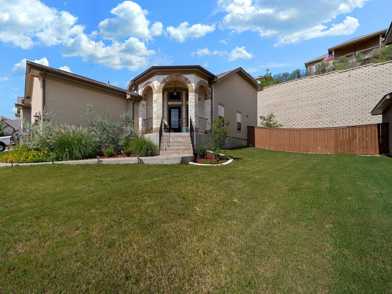 This gorgeous CROWNRIDGE two-story home is the Hickory floor plan (see Diagram in Associated Docs). Soaring ceilings and a stunning catwalk staircase highlight the open concept floorplan with two living spaces, one up/one down. The master suite is split and is located downstairs, offering a decorator walk-in shower with a glass-block wall. Beautiful, easy-care ceramic tile flooring in the entry and throughout the first-floor living area, kitchen, and bathrooms. The ultra-contemporary kitchen includes stainless steel appliances, granite countertops, gas cooking, and a built-in oven and microwave. A refrigerator is also included. Features include stucco/stone exterior, 10-foot ceilings with 8-foot interior doors on the first floor, 9-foot ceilings on the second floor, plus brushed nickel plumbing and lighting fixtures. Ceiling fans in every bedroom provide lower utilities and comfort. Outside is a double patio partially covered for relaxation and play, an extended stucco privacy wall, and much more. Don't miss it!