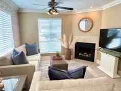 This exquisite, move-in-ready 1-bedroom condo (approx. 600 sq. ft.) is located just steps from the beach and offers everything you need for comfortable, stylish living. Fully furnished and beautifully decorated with brand-new furnishings, flooring and brand-new upgraded bathroom. It features a cozy fireplace, a queen-size bed, 2 TVs, and a well-equipped kitchen with oven/range, refrigerator, dishwasher, microwave, granite countertops, and gorgeous cabinetry. You'll also have linens, dishes, and cookware included--just bring your suitcase! Private parking is assigned near the living room window.