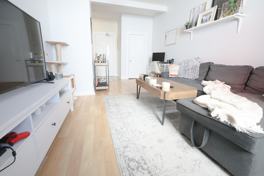 Recently installed high-quality laminate flooring looks great and is easy to maintain. Big, bright living room, and eat-in kitchen! Bedroom is easily large enough for a queen bed and a couple of dressers – bed in photos is a queen. Pantry in hallway, closet in bedroom, and extra closet in living room. 10 ft ceilings!