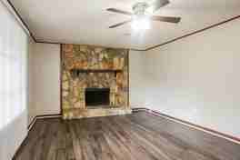 Inside, the main living area opens into a spacious room filled with natural light from large windows and sliding glass doors. Durable LVP flooring stretches across the space, while a striking stone-accent wall creates a focal point that adds character to the room. Ceiling fans and an open layout make the space comfortable for relaxing, gathering, or arranging your living and dining areas.
