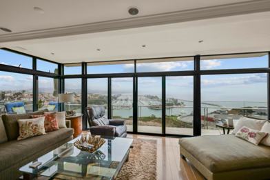 This luxurious contemporary two-story home offers dazzling 180-degree views of Dana Point Harbor and Capo Beach! Directly beside the two-car garage, the elevator takes you to the front door of this designer home with floor-to-ceiling glass walls exquisitely framing the view from the entry, kitchen, and living room. A wrap-around balcony features a built-in Barbecue station and outdoor dining set ideal for entertaining. The open-space gourmet kitchen features beautiful custom wood cabinetry, top-of-the-line Miele appliances, an integrated Sub Zero, a wine fridge, a built-in espresso bar, and a massive walk-in butler's pantry. A glamorous guest bathroom features tasteful designer touches. The downstairs level features three spacious bedrooms with ocean views from each and two additional bathrooms. A grand master suite features a master bathroom with spa-like amenities including an extra spacious double vanity, full steam shower, sauna, and Jacuzzi tub that fills from the ceiling!