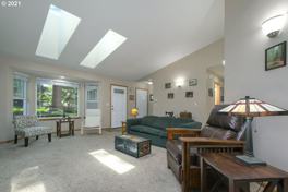 Enter into the living room to find vaulted ceilings with skylights- tons of natural light! Continue on to the dining area or kitchen, which features ample storage and all stainless steel appliances.