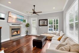 This two-story townhome offers a bright and open layout with abundant natural light, elegant archways, and rich wood flooring throughout the main living areas. The spacious living room includes a cozy wood-burning fireplace and large windows overlooking the tree-lined street.