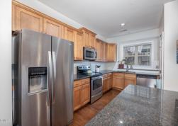 Beautiful end unit townhome loaded with upgrades and thoughtfully maintained throughout. This home features hardwood floors across the entire first floor, stainless steel appliances, elegant decorative molding and an open layout that offers both comfort and functionality. The kitchen provides ample cabinet space, granite countertops and a seamless flow into the living and dining areas, making it ideal for everyday living and entertaining. Enjoy the added privacy of an end unit along with extra natural light and a more open feel. The primary suite offers a spacious layout with a walk in closet and an en suite bath featuring dual vanities and a walk in shower. Additional bedroom provides flexibility for a roommate, guests, a home office or additional living space. Step outside to a private patio area perfect for relaxing or enjoying a quiet evening. The setting offers a peaceful backdrop just steps from a nearby pond and walking trail, ideal for enjoying the outdoors. Conveniently located with easy access to shopping, dining and major roadways. Just 5.4 miles to downtown Raleigh and 13 miles to RDU, offering an ideal balance of accessibility and everyday convenience.