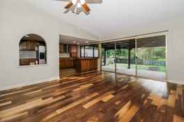 Inside, the layout unfolds into multiple connected living spaces finished with hardwood flooring, allowing for clear separation between everyday activities and more relaxed settings. Fresh interior paint gives the home a clean, cohesive feel throughout. The kitchen sits centrally and features ample wood cabinetry, durable countertops, stainless steel appliances, and an island that supports both prep space and casual seating. An arched pass-through connects the kitchen to the living area, maintaining flow while defining each space.