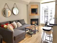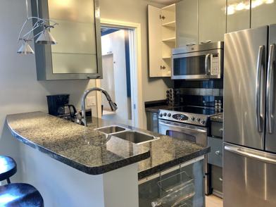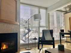 Waterfall shower and soaker tub with heated towel rack. Gas operated fireplace and full size kitchen with stainless steel appliances. Custom build-in Murphy bed, dining area, walk-in closet and in-suite washer and dryer!