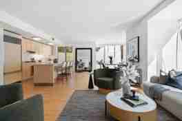Luxurious southwest corner residence featuring an expansive and highly sought-after floor plan with 2 bedrooms, 3 full bathrooms, a library, and a private terrace with captivating City views overlooking Salesforce Park and the Downtown skyline. Flooded with natural light, the open-concept living and dining area showcases floor-to-ceiling windows and hardwood flooring throughout. The spacious chef's kitchen is equipped with a center island, stone countertops, Bosch and Sub-Zero appliances, a 4-burner gas cooktop, hideaway refrigerator and microwave, and abundant cabinetry. The generous primary suite offers excellent storage with a large closet and walk-in closet, along with a spa-like en-suite bathroom featuring dual vanities, a soaking tub, and a separate walk-in shower.