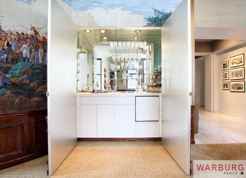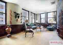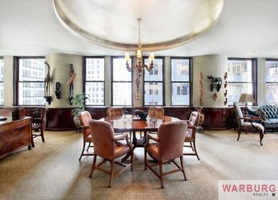 OURS ALONE...Extraordinary 2,300 sq. ft. furnished Financial District residence: Enter the elegant marbled hallway into an 800 sq. ft. living/dining space appointed with handsome leather and antique furniture throughout. The painted mural of the Napoleonic war covers a secret panel that conceals an impressive hidden mirrored wet bar. Southern, eastern, and western views light the space via 13 oversized double paned windows. The apt is filled with a fine collection of African, Native American, and modern wood sculptures. Newly renovated kitchen appointed with stainless appliances and granite counter tops. Master bedroom with en suite bathroom and a second oversized bedroom can double as an office, media or conference room. There is an additional 2nd bathroom with marble finishes and a separate real laundry room with side by side washer and vented dryer. Ample closet and storage throughout as well as state-of-the-art central air conditioning including humidity control and air purifier provides comfort year round. The 17th floor views encompass the Federal Reserve Bank of NY, New York Stock Exchange, and sunset/river views west. This is a full service building with 24 hour doorman, live in super, porters and a handy man.