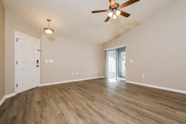 Along with a screened-in porch and pet-friendly fenced yard, this Gibsonton, FL rental home comes with three bedrooms, two bathrooms, and an attached garage. The living room in this ranch-style smart home has an open and airy feel, thanks to the vaulted ceiling and light neutral-colored walls. The open layout next leads into the kitchen, where you'll find quartz countertops, a serving bar, and a convenient double-basin sink. Store additional supplies in the large pantry. You'll love the modern wood-look plank flooring in the primary suite, which also comes with a ceiling fan and a big walk-in closet. There's an oversized vanity and a walk-in shower in the adjoining bathroom. Contact us to schedule your personal tour today!