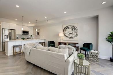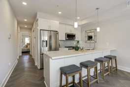 Bright, spacious, and open, this modern condo is the perfect place to call home! Enter the unit to the open living area and be greeted by warm, herringbone patterned hardwood floors and large windows for lovely natural light. Continue through to the chef-inspired kitchen, complete with pristine marble countertops, tiled backsplash, and a large island perfect for entertaining. Other kitchen features include a gas range, stainless steel appliances, and plenty of cabinet space to store all your kitchenware.