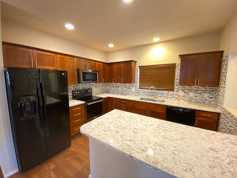Updated & contemporary two story, 3 bedroom, 2.5 bathroom home with plenty of space and amenities! Open floor plan with hardwood floors on main. Updated kitchen with quartz countertops, large island, gorgeous mosaic backsplash, ample cabinetry, and large dining area with slider to private patio. The master bedroom has vaulted ceiling, two large double-doored closets, and bath with double vanities. Enjoy the recently purchased appliances including a front-loading washing machine & dryer. Vinyl flooring throughout, lots of natural lighting, fresh interior paint, and a quiet neighborhood!