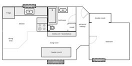 There is a shelving unit, kitchenette table and chairs and a full size modern couch provided for your use and convenience, as shown in the photos. You would need to provide a double bed and other furniture.