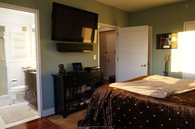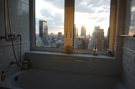 Large 1 Bedroom / 1.5 Bath corner unit facing North/West. Comes fully furnished. Washer and dryer in the unit. High floor with sweeping NYC Skyline views! Kitchen and Masterbath are both windowed! New wide-plank Mahogany wood floors throughout unit. Unit has many upgrades including custom closets, state of the art surround sound entertainment center with 60 Plasma, full wall Wenge wood custom built entertainment center, newly remodeled bathrooms with granite counters and marble floors, Hunter Douglas window treatments, and comes fully networked with in-wall computer jacks throughout the unit. One of a kind apartment in the building! A must see!