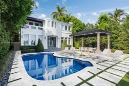 This waterfront home on San Marino offers the hard to find 6 bedrooms on the Venetians Islands. Featuring marble and wood flooring, wall paneling, and beachy chic furnishings. Water views are afforded to the social areas and the sizable kitchen complete with a Viking 6 burner cooktop, white marble counters + eat-in island, Subzero refrigeration & wine wall as well as sliding glass for privacy. Entertain from 3 distinct areas - the living room, fireplace room, and waterfront dining setting. The primary suite spans the full Eastern position with an expansive dressing room and private terrace. Arrive home to your elegant brick driveway past privacy hedges. The East facing backyard with breezes off the ocean offers a mosaic-tiled pool, canopy covered dining table, & dock.