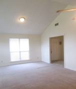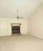 This 1,750 sq ft home features a spacious living room with vaulted ceilings, a fireplace, and ceiling fans. The kitchen offers plenty of cabinet storage and comes equipped with a refrigerator, stove/oven, and dishwasher. A connected dining room provides a functional space for meals and gatherings.