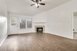 Step through the front door into a bright, open-concept living space with soaring vaulted ceilings, wood-look tile plank flooring, and a stunning corner wood-burning fireplace framed in tile. Designer lantern pendants light the entry and hallway, while large windows and a backyard access door fill the room with natural light. The space flows seamlessly into a fully renovated kitchen featuring white shaker cabinetry, granite countertops, a subway tile backsplash, stainless steel appliances, and an oversized breakfast bar — perfect for entertaining or a quick morning coffee.