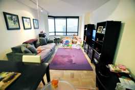 This convertible 2 bedroom, 1 bath apartment has a spacious living and dining space with large bay windows that lend a bright and open feeling to the space. The soundproofed windows provide the beauty of downtown Manhattan views in both the living room and bedroom without the noise. This full-service elevator building offers many attractive amenities including a 24-hour doorman and concierge, a common roof deck, health club, and swimming pool - all with spectacular city views. The building also provides a party room, a garage, a laundry room, a children s playroom and bike and storage rooms.
