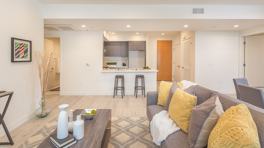 Modern 3 bedroom, 2 bath unit at 1335 sq. ft. with custom kitchen cabinetry and quartz stone counter-tops, stainless steel appliances, and balcony. Unit is very quiet and peaceful.
