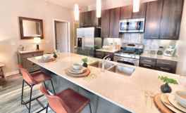 Interior features and finishes are just as nice, starting with hardwood floors, soaring ceilings and floor-to-ceiling windows. Custom kitchen cabinets are accented with granite countertops, stainless steel appliances and designer pendant lighting, and every apartment comes with full-size washers and dryers and a private balcony or terrace. These beautiful apartments are perfect for entertaining or just being a homebody.