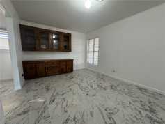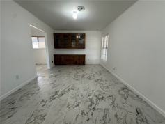 This three-bedroom home sits on an extra-large, fenced corner lot with mature trees providing plenty of shade. The four-sided brick exterior and storm shutters add extra protection during storms. Inside, the all-tile flooring complements two living areas-one a living/dining combo with a built-in china buffet, and the other featuring a brick accent wall, overhead lighting, and patio access. The galley kitchen offers white cabinets, ample counter space, and black-and-white appliances, including an electric smooth-top stove/oven, vent hood, dishwasher, countertop microwave, and refrigerator, with easy access to the garage where washer and dryer hookups are located. Three oversized bedrooms and two bathrooms feature tiled showers, with the main bath boasting an extended vanity. Recent updates include HVAC, interior paint, appliances, flooring, and baths. The spacious front and back yards provide plenty of room for outdoor fun.