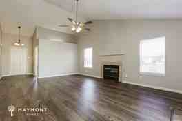 Inside, the main living area features durable LVP flooring and vaulted ceilings that add volume and openness. The living space connects seamlessly to the dining area, which sits just off the kitchen, making everyday routines and gatherings feel effortless. The kitchen includes ample cabinetry, generous counter space, stainless steel appliances, and a breakfast bar that opens to the dining area for added functionality.