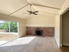 Great room has vaulted ceilings and big sliding door out to the backyard.