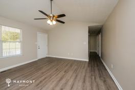 Inside, the living area features LVP flooring and a ceiling fan, creating a comfortable and easy-to-maintain space. The LVP flooring continues into the kitchen, which includes matching black appliances, ample cabinetry, and a stylish backsplash that adds visual interest.
