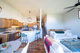 The kitchen features tons of cabinetry, stainless steel appliances, a generous center island, and easy flow into the dining and living areas. The living room is the perfect cozy spot, complete with a beautiful working fireplace. Off the dining room, enjoy your private deck with stairs that lead down to the backyard and patio—great for relaxing or hosting guests.