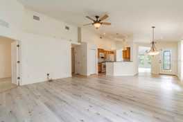 Charming 3 bedroom, 2 bathroom single-family home for Rent. Home offers a bright split, open floor plan with VAULTED CEILINGS and a large living room that can be used as a den or FLEX SPACE, iMaster Bedroom and 2 guest bedrooms. Kitchen showcases the larger kitchen option offered by the home builder, Corian counters, LOTS of WOOD CABINETS, GAS RANGE, and breakfast bar. EXTENDED SCREENED LANAI. Water softener