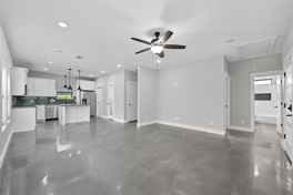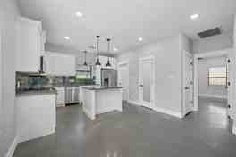 The designer concrete floors add a touch of sophistication and durability throughout the main living areas, while large windows invite abundant natural light, creating a bright and welcoming atmosphere.