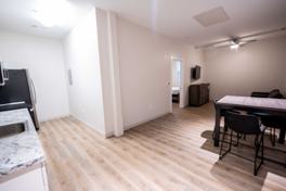 Our one bedroom fully furnished apartments offer high ceilings, modern interior colors, and LVP flooring. Tenants will have high-quality queen bedroom sets, dining sets, living room sets, wall-mounted smart TVs, Hunter ceiling fans, cordless window blinds, kitchens, and en-suite bathrooms. Kitchens come with white cabinetry, stainless steel appliances, pull-out kitchen faucets, and one basin sinks. Bathroom hardware accents are brushed nickel. All utilities (electricity, water/sewer, gas water heaters, LED lighting, high-speed internet) are included along with free parking for hassle-free living. Onsite commercial laundry facilities, fitness room, mail center, and elevator round out the amenities. Projected move-in date noted. Located a few blocks from Pfeiffer University (Health Sciences Center).