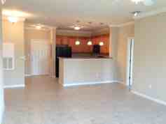 Apartments feature 9-foot ceilings throughout with ceramic tile floors in the common areas and carpeted bedrooms. The living room and bedrooms feature a lighted ceiling fan and faux wood blinds. The stylish kitchen has a breakfast bar, wood cabinets and black appliances including a side-by-side refrigerator with ice and water dispensers, a smooth top range, a built-in microwave range hood, a dishwasher and a disposal. The indoor laundry room has a stack washer and dryer. All bathrooms have tiled tub/shower areas, linen closets and wood cabinets with over-sized mirrors with stylish lighting and fixtures.