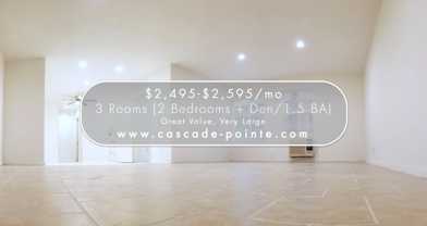 Cascade Pointe is showing a large 3 room unit (2 bedroom + den), 1.5 bath available now. Large, upgraded unit under RENT CONTROL means your rental price is protected. Large unit with open floor plan, kitchen peaking into your dining/living area. Beautiful tile floors throughout offer a warm look, with a cool feel which makes all the difference when that Los Angeles sunshine turns up the temperature. Comes with stove, oven, microwave. Plenty of storage space, over-sized sliding closets. Modern smooth ceilings w/ beautiful LED recessed lighting. AC/Heat. Ceiling fan. PARKING INCLUDED - 1 assigned space. PETS: cats only. Large laundry facilities on-site. UTILITIES INCLUDED - We cover 100% water, gas for hot water, trash, gardener. NO HIDDEN FEES. 1-year lease.$2,495-$2,595/mo. Price specials are move-in right away for new tenants.1,100 sqft. Deposit: $1,250. Shown by appt only. Call (818) 781-2731 for more info/requests. Equal Housing Opportunity. Prices subject to change without notice