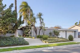 The home offers tranquility and outstanding possibilities for indoor and outdoor entertaining. It features four bedrooms and 2 and ¾ baths, plus a dedicated office, a den and a bonus room. This immaculate single level residence showcases numerous architectural details and exceptional upkeep. Enter through a light-filled atrium that leads into an open-plan living room featuring a sunken conversation area with a streamlined upholstered built-in sofa. The adjoining dining area features a mid-century crystal chandelier.