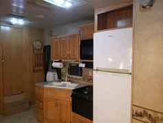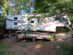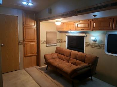 Purchase outright and take it away, or if you rent to own it must stay in rustic pines rv park, no exceptions. Good tires several years old barely used. Has a $1500 Reese goose box. Lightweight aluminum structure with two slide outs. Awning shows wear but still useable. Queen in master bedroom, 4 bunk beds in rear room. No leaks or water damage. AC works well., as does the fridge, stove, and water heater.