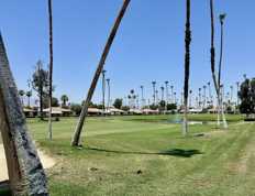Welcome to your perfect desert oasis! This inviting home features 2 bedrooms plus a spacious den, ideal for a home office, guest space, or cozy TV lounge. The open living area boasts vaulted ceilings, floor-to-ceiling mirrors, and expansive windows with vertical blinds that allow for excellent natural light and privacy control. Step outside to the covered patio, where you can relax or entertain while enjoying the stunning scenery of surrounding mountains and a peaceful lake-perfect for morning coffee or sunset gatherings. The master bedroom offers a tranquil retreat with generous space and natural light. The ensuite bath and ample closet space make it as functional as it is comfortable. The secondary bedroom features two single beds, ideal for guests or family, and is located near a full hall bathroom for added convenience. The bright and airy layout continues with plush seating in the main living space, a ceiling fan, and a wall-mounted TV. The kitchen includes classic white cabinetry, ample counter space, and vintage appliances that add charm and practicality. Tile flooring throughout keeps the home cool and easy to maintain. This home delivers comfort, character, and stunning views in a quiet desert community.
