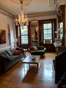 South End HUGE 2 bedroom 2.5 bath duplex on Blackstone Park with gorgeous original details! 12 ft ceilings and ornate carvings on main entertaining level which consists of oversized fireplaced living room, formal fireplaced dining room and fireplaced eat in kitchen. Access to private patio from the dining room. Downstairs has two enormous bedroom suites and laundry. Heat and hot water included, parking available to rent. Available for Jan 1 move in, or possibly later.