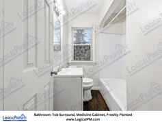 The bathroom boasts a beautifully designed tub surround, creating a relaxing space for unwinding. The durable vinyl flooring is both stylish and easy to maintain, while the freshly painted walls give the room a clean and updated look.