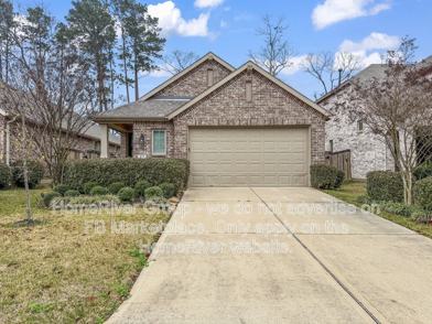 Stunning three-bedroom, two-bath single-story home offers modern comfort and elevated style in the highly desirable Woodlands Hills master-planned community. Designed with todays lifestyle in mind, the home features high ceilings, upgraded doors, and an open-concept layout that creates a bright, welcoming atmosphere throughout. The spacious living area flows seamlessly into a beautifully appointed kitchen complete with a large center island, granite countertops, stainless steel appliances, a sleek single-basin sink, breakfast bar seating, and a charming dining nook that's perfect for everyday living and entertaining alike. The private primary suite serves as a relaxing retreat with a generous walk-in closet, dual vanities, and a spa-inspired ensuite featuring a separate glass-enclosed shower and soaking garden tub. Step outside to enjoy the extended covered patio and lush, fenced backyard, offering extra privacy with no rear neighbors. Located in The Woodlands Hills, residents enjoy access to an exceptional array of amenities, including a 17-acre central park, multiple resort-style pools with a lazy river and lap pool, a 10,000+ square foot activity and fitness center, miles of scenic walking and biking trails, and over 20 planned parks and green spaces, along with tennis courts, playgrounds, and dog parks, making this home the perfect blend of luxury living and community-focused convenience.