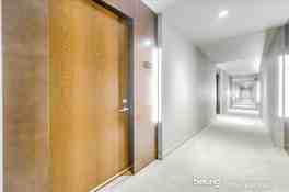 The private patio looks out onto the lush courtyard. Hardwood floors and lofty ceilings make for expansive spaces to entertain and relax in. Smart features allow for automated drapes and light switches.
