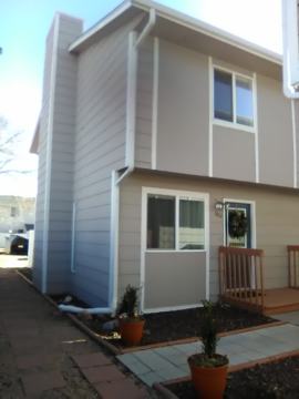 very clean end unit, 2 bedroom, 1 1/2 bathroom newly updated townhome , all windows and doors replaced, updated bathrooms, new paint throughout, new lighting , ceiling fans in bedrooms, kitchen updated, living room with fireplace, laminate flooring throughout, bathroom and enter way with tile floor. Appliances include Refrigerator, electric stove, Microwave, and it comes with washer and dryer located off the kitchen. Trash collection included in the rent. Easy access to Fort Carson and Peterson Air force base, schools and shopping. One assigned parking space .
