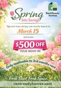 SPECIAL PROMO: SIGN A LEASE AND PAY SECURITY DEPOSIT BY MARCH 15TH AND GET $500 OFF YOUR FIRST MONTH OF RENT!