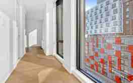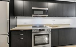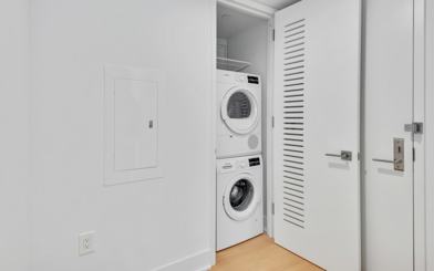 High floor studio with unique T shape layout, city views, and in-unit Bosch washer/dryer.